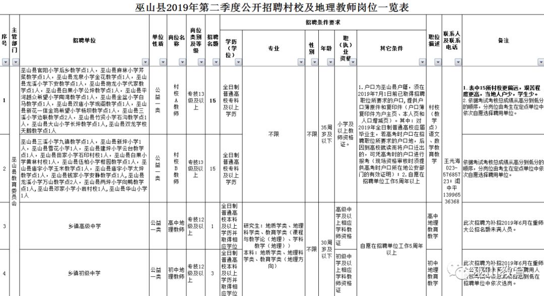二、招聘计划 本次面向社会公开招聘教育事业单位村校教师和地理教师共34名,具体招聘单位和岗位详见《巫山县2019年第三季度公开招聘村校和地理教师岗位一览表》(附件3),以下简称《一览表》)。