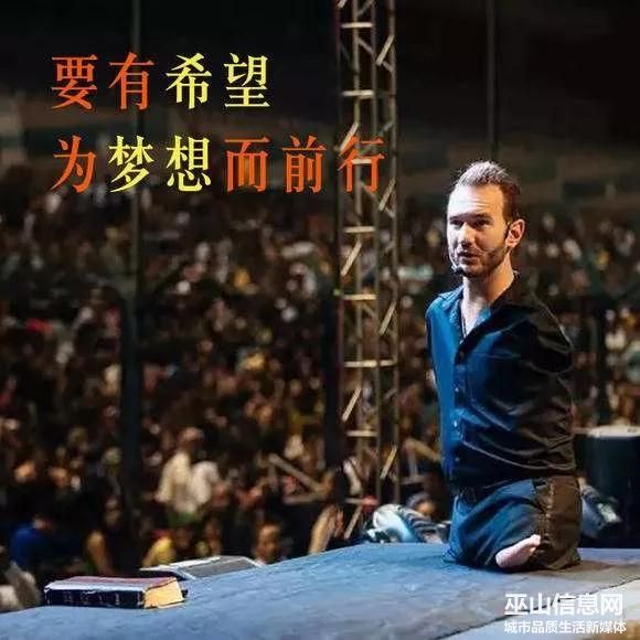 未来,你的企业又该怎么赚钱? 这是无数巫山商家、企业老板的困惑 在如今飞速发展的经济时代 如何更有突破性的寻找新的机遇 又如何才能更好的管理企业 这里,将会告诉你答案 《商业真经.国际研讨会》重庆站 即将震撼来袭!!! 你或许需要他来为你指点迷津 人们称他为 点亮生命的** 世界励志演讲家 我相信 你听过他的名字 尼克·胡哲 ▼ 尼克·胡哲(Nick Vujicic),1982年12月4日出生于澳大利亚墨尔本,天生没有四肢,只有左侧臀部以下的位置有一个带着两个脚趾头的小“脚”。即便如此,他依旧突破了身体的极限,创造了一个又一个的奇迹。