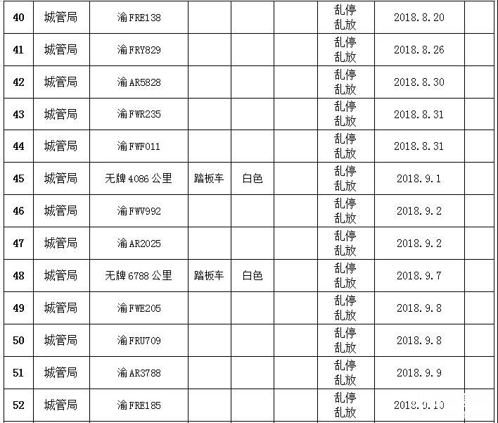 为加强城区车辆停放管理,县城市管理局对未按规定停放的车辆实施拖移暂扣,绝大部分车主接受处罚并领取了车辆。现将2018年5月至12月扣押、扣留的无主、无人认领的摩托车向社会公示,请各车主在公示期内带上车辆购车发票、车辆合格证等有效证件及时到巫山县城市管理局停车管理执法大队(广东西路19号)接受处理,逾期不来接受处理的车辆,将在公示期满后依法予以集中报废。 (公示期:2019年10月15日至2020年1月15日) 报废无人认领车辆明细表公布如下