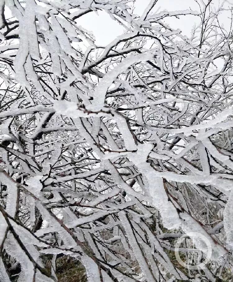 树枝上美丽的冰挂 同时,今天的黄安坝也是飘起了雪