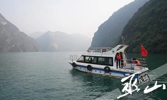 清晨的巫山,云雾挂山间。纬度 31°01′38.1642″,经度110°06′37.026″的长江培石断面,是长江流经重庆进入湖北的省界断面,也是重庆长江干流出境水水质国家考核断面。工作人员驾驶监测船,取水检测。结果显示,水质类别达到《地表水环境质量标准》(GB3838-2002)Ⅱ类水质标准。