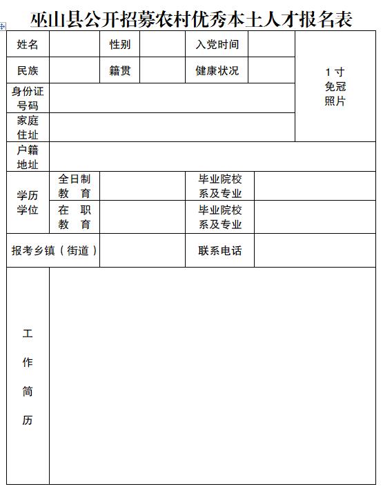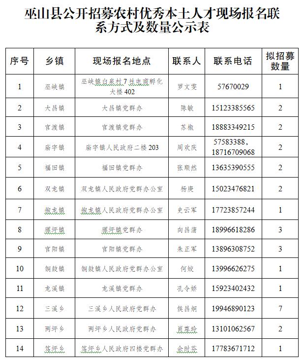 三、选拔程序 (一)自主报名 1.报名时间:2021年 1 月 7 日至 1 月 14 日止。 2.报名方式:可通过现场报名和电子邮箱报名两种方式。 ①现场报名:各乡镇党委、街道党工委均设置现场报名点,可就近报名,详见附件1。 ②电子邮箱报名:将报名材料发1005317146@qq.com。 3.报名材料:本人身份证原件和复印件,毕业证原件和复印件,以及其他能证明相关经历和身份的材料,如退役军人、党员证明等原件和复印件。如实填写《巫山县公开招募农村优秀本土人才报名表》(附件2)。各乡镇(街道)于2021年 1 月 15 [url=mailto:%E6%97%A5%E5%B0%86%E6%8A%A5%E5%90%8D%E8%8A%B1%E5%90%8D%E5%86%8C%E6%8A%A5%E5%8E%BF%E5%A7%94%E7%BB%84%E7%BB%87%E9%83%A8%E7%BB%84%E7%BB%87%E4%B8%80%E7%A7%91%EF%BC%8C1005317146@qq.com%E3%80%82]日18:00时前,将《巫山县公开招募农村优秀本土人才汇总表》(附件3)报县委组织部组织一科,1005317146@qq.com。[/url] (二)统一考试 笔试时间和地点详见准考证。考试内容为《综合基础知识》,满分为100分。取得大学专科毕业证书、大学本科毕业证书的,考试成绩加5分、10分。考试由县委组织部统一考试、统一标准、统一阅卷。根据考生报考乡镇按考试成绩(含加分)从高分到低分确定人选。已在村任职的本土人才不参加统一考试。 (三)任前联审 各乡镇党委对拟招募人选任职资格进行初审。初审合格的,报县委组织部联合县纪委监委、县委政法委、县公安局、县法院、县检察院等进行资格联合审查。资格审查不合格的,按分数进行递补。 (四)组织考察 对通过任前联审的人选,由乡镇(街道)党(工)委成立考察组进行考察,形成考察材料。考察中,坚持把政治标准放在首位,深入考察人选思想政治素质、道德品行,群众评价等情况。 (五)人员公示 经过审查合格人员在“巫山发布”和“巫山党员教育”微信公众号和各乡镇等公示5个工作日。