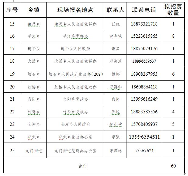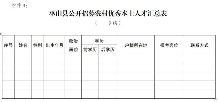 为建立健全农村优秀人才引得回、留得住、用得好的良性机制,提升农村干部队伍整体素质,推动乡村人才振兴和组织振兴,根据中共巫山县委办公室、巫山县人民政府办公室《关于加强农村基层本土干部人才队伍建设的通知》(巫山委办〔2015〕10号)精神,决定面向全县农村公开招募60名本土优秀人才到村挂职任职。现将有关事宜公告如下: