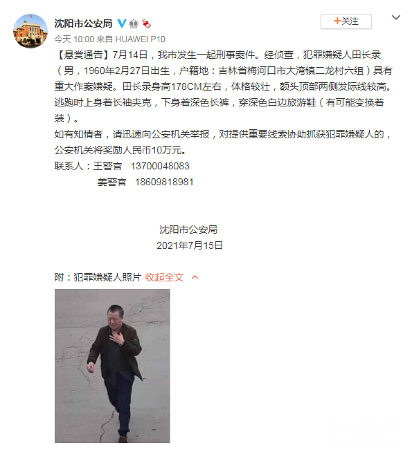 如有知情者,请迅速向公安机关举报,对提供重要线索协助抓获犯罪嫌疑人的,公安机关将奖励人民币10万元。