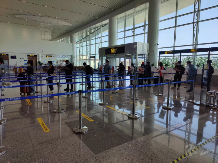 保持一米线 据了解,为减少疫情传播风险,重庆巫山机场设置入境人员专用隔离区域、重点地区来巫返巫人员专用通道,持续加强对入境人员和国内中高风险区以及健康码和行程卡非绿码的来巫返巫人员的排查和管控,一旦发现异常将通过专用通道引导旅客前往发热人员观察区,并做好旅客信息上报及转移工作。 重庆巫山神女峰机场有限公司安全质量部业务助理张欣告诉记者,重庆巫山机场也非常注重在“物”的方面的防护。为了确保环境公共卫生安全,重庆巫山机场每周开展两次环境核酸检测,每个航班结束后会对公共区域进行一次全面的消杀,同时,对运输旅客行李的传送带、行李车进行一运一消。