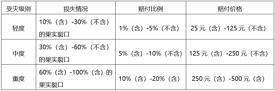 针对落果、裂口的不同类别的受灾情况,将分成轻度、中度、重度三个受灾级别并确定相应的赔付比例,两种或两种以上症状造成的损失按照最严重的受灾级别进行赔付,不累加赔付。 (1)裂口  (2)落果