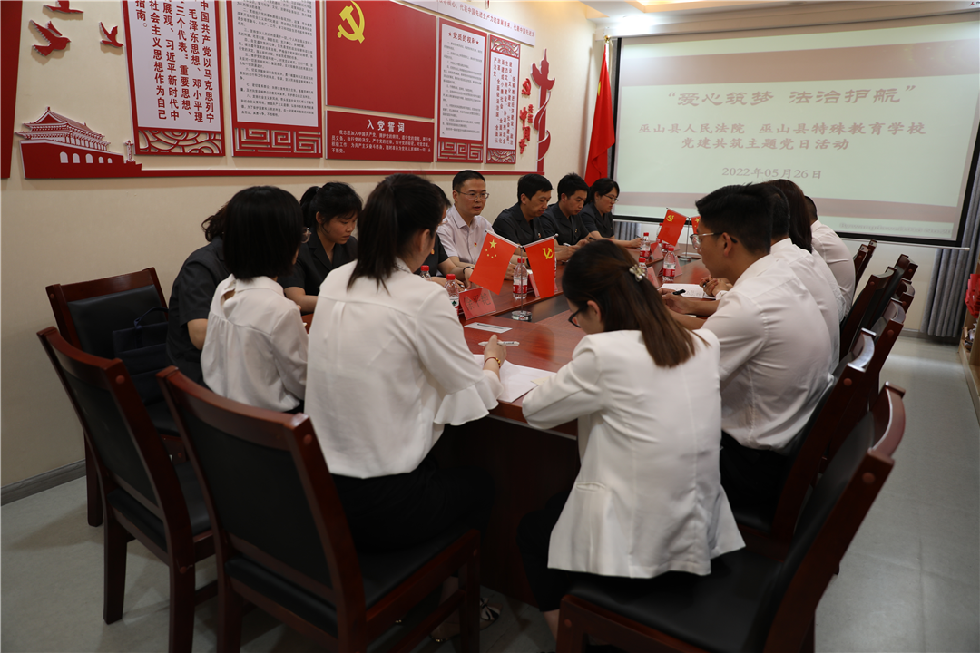 为加强未成年人保护工作,在“六一”国际儿童节来临之际,5月26日下午,巫山法院机关党支部走进巫山县特殊教育学校,开展“爱心筑梦·法治护航”支部共建主题党日活动,并为学生们送去“法治大餐”和爱心校服。巫山法院党组书记、院长吴美来,党组成员、政治部主任宋功兵参加活动。