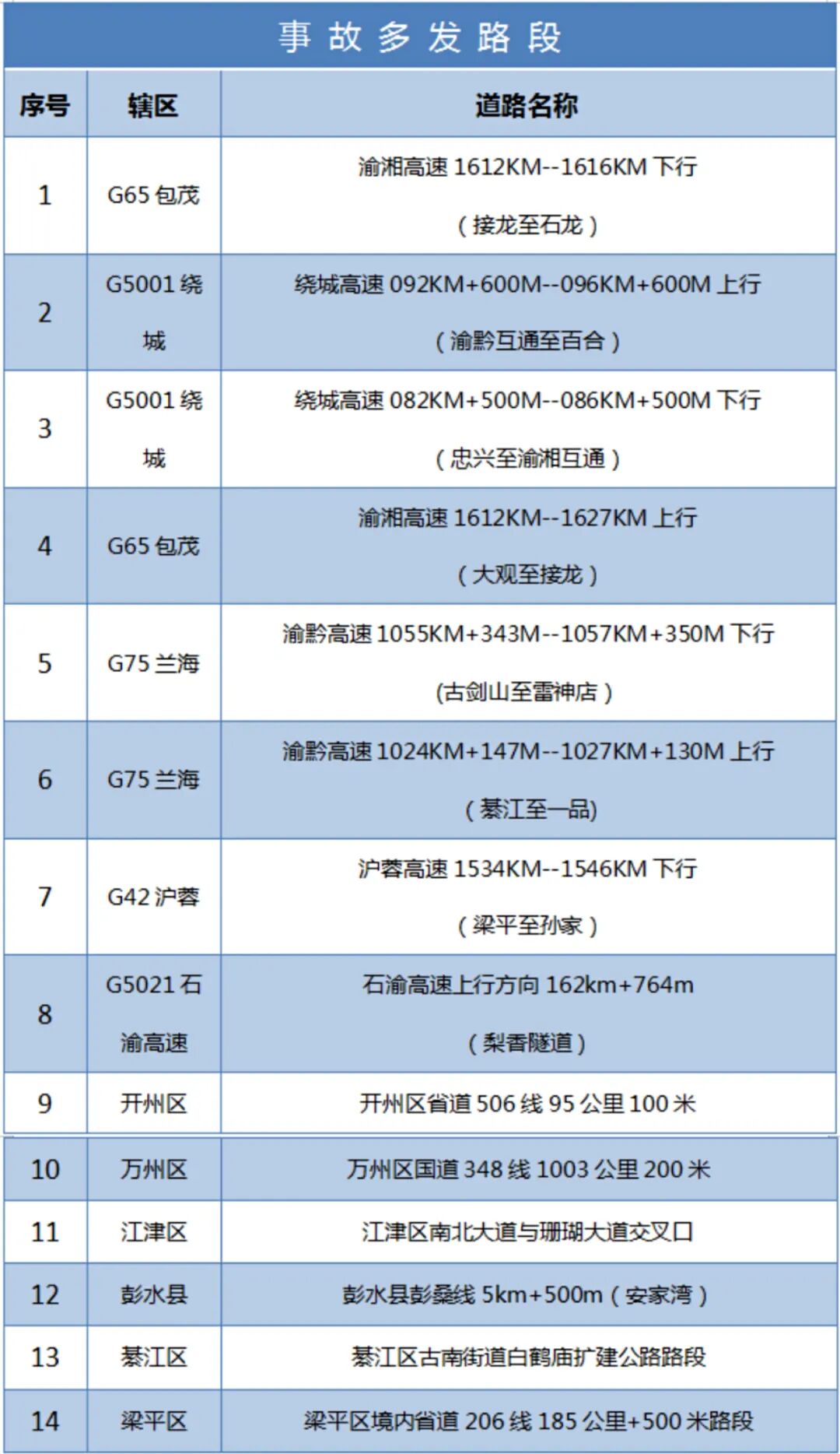 端午节假期将至,群众外出旅游、返乡探亲等中短途出行集中,路网整体通行压力上升,加之节日期间全市以阴雨天气为主,道路交通安全风险加大。对此,市公安局交巡警总队按照道路交通事故预防“减量控大”工作部署要求,在全市范围内开展道路交通安全隐患排查,(今日)向社会发布14处事故多发路段,希望广大交通参与者途经以下路段时注意谨慎驾驶,合理安排出行计划,确保行车安全。  交巡警提醒: