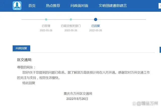 您好!关于您提到的问题已收悉。据了解郑万高铁预计将在六月开通。感谢您对万州交通工作的关注与支持,祝您生活愉快。