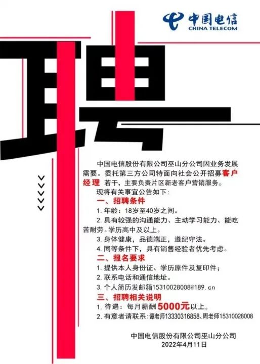 标题: 招聘 详细描述 :中国电信股份有限公司巫山分公司因业务发展需要。委托第三方公司特面向社会公开招募客户经理 若干,主要负责片区新老客户营销服务。现将有关事宜公告如下: 一、招聘条件 1.年龄:18岁至40岁之间。2.具有较强的沟通能力、主动学习能力、能吃苦耐劳。学历高中及以上。3.身体健康,品德端正,遵纪守法。4.同等条件下,具有销售经验者优先考虑。二、报名要求 1.提供本人身份证、学历原件及复印件; 2.联系电话和通信地址。3.个人简历发邮箱15310028008@189.cn 三、招聘相关说明 1.待遇:每月薪酬5000元以上。2.有意者请联系:谭老师 13330316858周老师15310028008 中国电信股份有限公司巫山分公司 2022年4月11日 联系电话: 谭老师 13330316858周老师15310028008