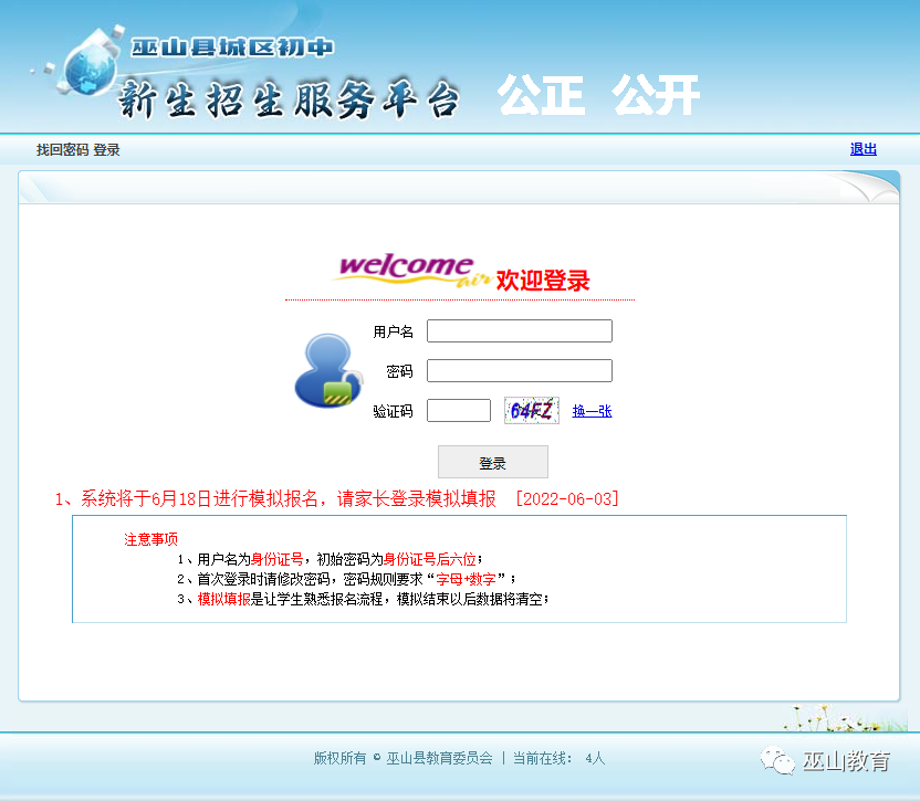一、网址 线路一:http://222.180.85.243:8891/CZBM1 线路二:http://222.180.85.243:8891/CZBM2 或关注“巫山教育”微信公众号,点击入学报名——初中招生,进入相关程序链接;   用手机扫描二维码,或电脑登录,将出现如下界面: