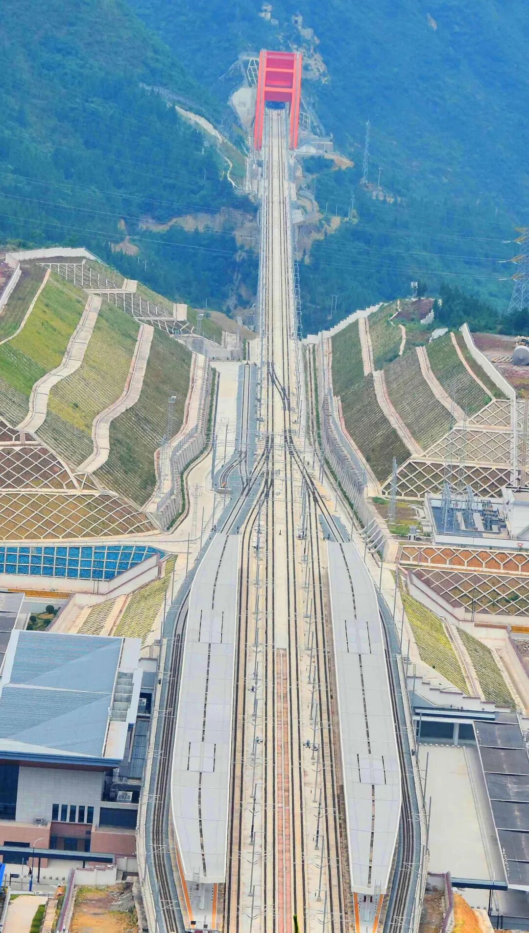 6月11日,俯拍的郑渝高铁巫山站全景。巫山站属郑渝高铁重庆段最后一个车站,地处重庆市巫山县桂花村。车站内共设验证闸机3台,进站检票闸机12台、半自助闸机4台,出站闸机6台、半自助闸机2台,采用双向直进式安检通道,方便旅客进站。