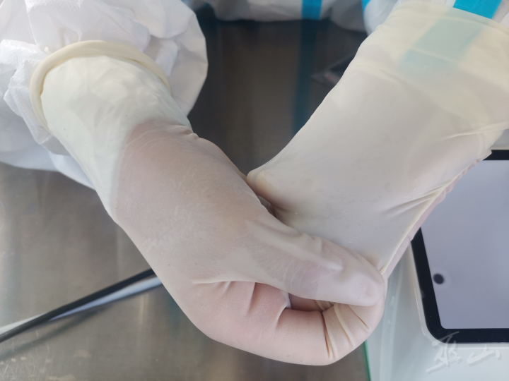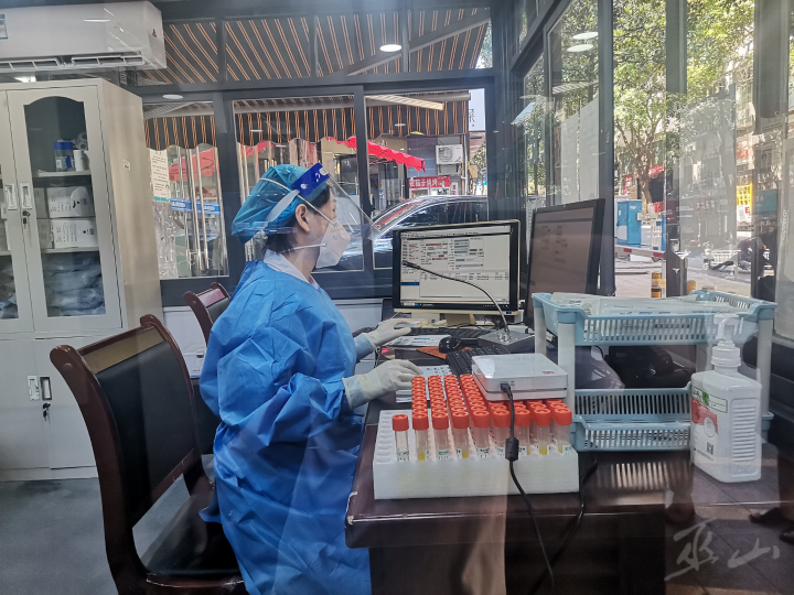 “摘下口罩、张开嘴……啊……”医护人员将一根无菌长棉签伸入受检者口腔深处,停留几秒,获得咽拭子后,将棉签头部置入螺口管,棉签顶端折断,保存在采样管里。整个过程迅速规范,但这个看似简单的动作,他们每天需要重复几百次。