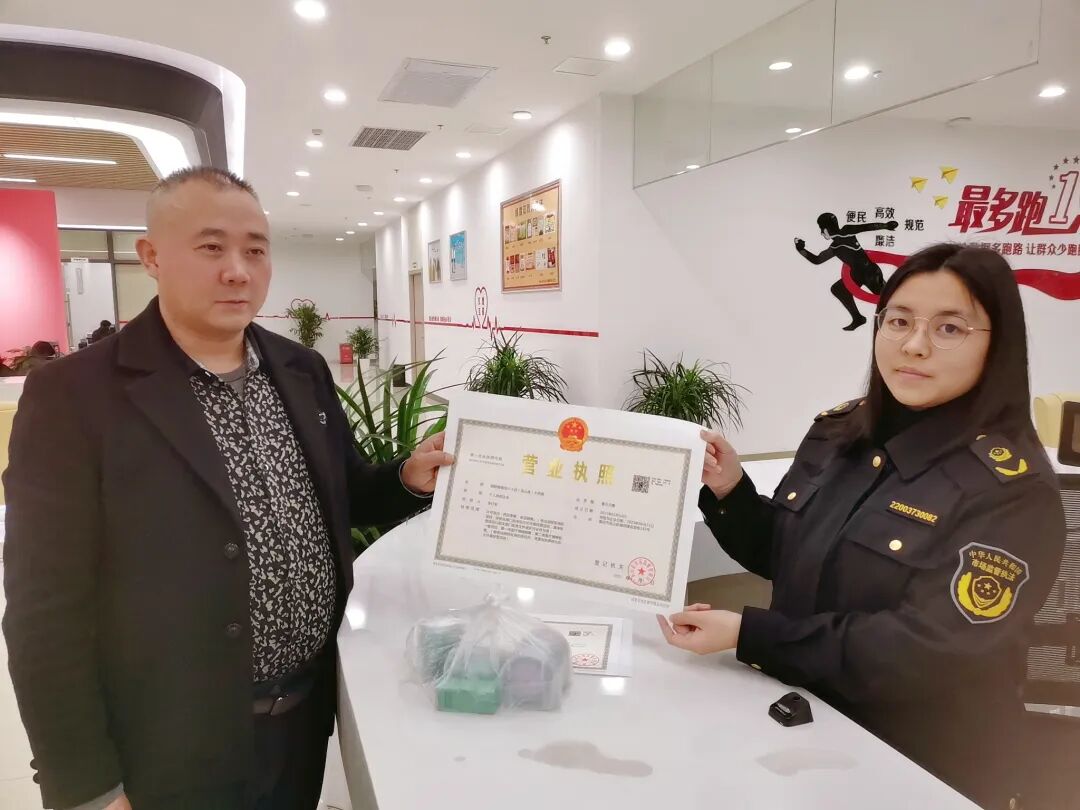 “从办证、审批 到拿到营业执照不到一个小时, 没想到‘个转企’业务办理速度这么快。” 4月23日, 县市场监督管理局为个体户李先生 核发了我县第一张“个转企”营业执照, 李先生接过营业执照高兴地说。